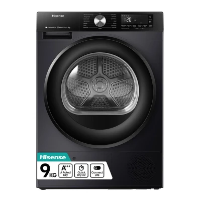 Waiting for your clothes to dry can feel a bit like watching paint dry. This Hisense tumble dryer's Quick Dry 30' program will have a smaller load ready to wear in just half an hour. It's a life saver when you're running late for work. It's Auto Dry feature uses high-precision sensors to monitor temperature and moisture levels and automatically adjusts the drying time. It prevents over-drying which can damage your clothes. And the Allergy Care program uses hot air to banish bacteria, germs and other allergens from your clothes. Good news if you suffer from seasonal sniffles.Good to know- The Refresh function uses cool air to get rid of lingering odours - perfect for clothes that just need a freshen up- Download the ConnectLife app and get real-time information about your load and monitor your energy usage- Sync it to your compatible washing machine with Smart Link and together they'll work out the best cycle to use- Its large porthole door makes it easy to throw in large items like beach towels and bed sheets