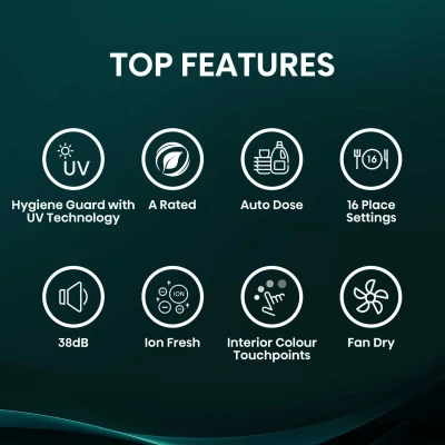 AmazonHygiene Guard with UV Technology - UV technology to remove 99.9% of bacteria A Rated - A-rated efficiency for every wash Auto Dose - Measuring the perfect amount of detergent 16 Place Settings - Large loads, maximum cleaning 38dB - 38dB Whisper quiet - perfect for open plan living