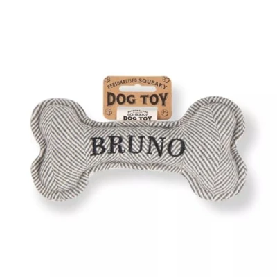 Pre-personalised squeaky dog toy. Popular breeds and dog names. Made from durable material. Bone shaped for your dogs delight. Over 100 titles to choose from.