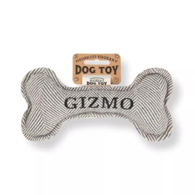Pre-personalised squeaky dog toy. Popular breeds and dog names. Made from durable material. Bone shaped for your dogs delight. Over 100 titles to choose from.