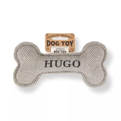 Pre-personalised squeaky dog toy. Popular breeds and dog names. Made from durable material. Bone shaped for your dogs delight. Over 100 titles to choose from.