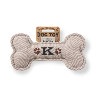 Pre-personalised squeaky dog toy. Popular breeds and dog names. Made from durable material. Bone shaped for your dogs delight. Over 100 titles to choose from.