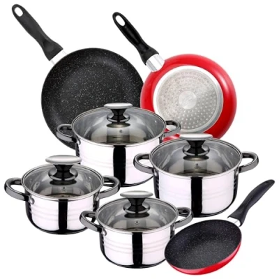Set of 3 frying pans + 8 piece battery Hita San Ignacio. The set of PANS is made of pressed aluminium with marble coating, with bakelite handles in black. Red on the outside and mottled black on the inside. The set consists of: Ø16 x 3.3 cm Ø20 x 3.5 cm Ø24 x 3.8 cm. They feature an induction bottom for better heat distribution. It is provided with a non-stick coating preventing food from sticking to the piece and facilitating cleaning. The kitchen battery consists of: 4 saucepans Ø16 x 9.5 cm – 1.9 L / Ø18 x 10.5 cm – 2.7 L / Ø20 x 11.5 cm – 3.5 L / Ø24 x 13.5 – 5.1 L. They have spectacular handles and knobs in dark contrast, for a chrome body, with detail of 3 elegant satin lines. The lids have valves and being made of glass you can monitor the cooking. Measuring scale inside. It is also suitable for all types of hobs., Weight: 12.566348934 pounds, Manufacturer: San Ignacio