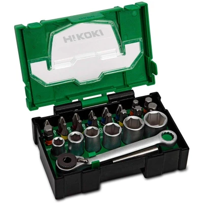 Set of socket wrenches and screwdriver bits HIKOKI 40030020 - The bit box with 24 pieces comes in a stackable case that makes it stack perfectly with other Hikoki stackable bit boxes. - Contains a ratchet set with sockets and a bit holder adapter - Featuring Torx, Philips, Pozi and Hez screwdriver bits - Ratchet and Socket set - Adapter for using screwdriver bits with ratchet - Stackable case, stackable with 6 other sets Content - T: 10, 15, 20, 25, 30, 40, - 1 x PH 1 - 2 x PH 2 - 1 x PZ 1 - 2 x PZ 2 - Hexagonal 4, 5, 6 - 6 x Socket Wrench; 6, 7, 8, 10, 11, 13 - 1 x 1/4" Adapter - 1 x 60mm Bit Holder With Lock - 1 x 90mm Ratchet
