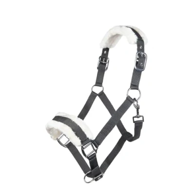 Stable halter with soft plush padding. Stable, silver-coloured fittings. Closures reinforced with rivets. Opens with carabiner hook. Material: 100 % polypropylene.