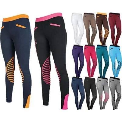 Breathable and skin-friendly riding leggings with knee patches made of high-quality silicone Stretch - Material: bi-elastic, comfort knitwear Leggings with elasticated leg cuffs and two front pockets with zip Silicone trim: good grip on the saddle and no chafing on the knee Material: 65 % cotton, 30 % nylon, 5 % elastane; machine washable at 30 °C, tumble dryer-safe