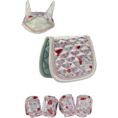 Miniature versions of the real horse products Design set consisting of: saddle cloth, ear bonnet, bandages With lovely heart motif Products for Cuddle Pony