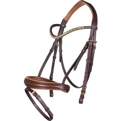 Padded headpiece Reins made from woven straps with leather stoppers Switching fastening Browband with synthetic diamonds