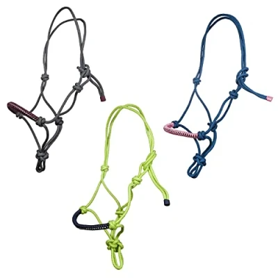 Set consists of 1 knotted halter, 1 pair of reins The halter and the collar are equipped Removable pendants with a pearl look The reins are equipped with two carabiners The reins can be attached to the knotted halter using two rings