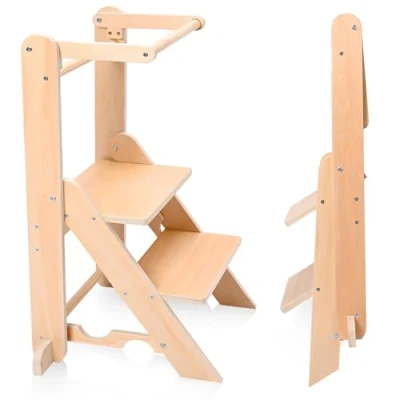Foldable Space Saving Design - Maximize your kitchen space with our innovative learning tower foldable feature that collapses to just 15cm depth! This space saving design allows effortless storage in closets or between appliances, making it ideal for European homes where efficient space utilization is essential while maintaining full functionality as a complete Montessori station. Adjustable Height Growing Tower - Designed to accommodate children from 18 months to 5 years, our learning tower features two adjustable height settings (35cm and 45cm) that support your child's development stages. The optimal step heights allow comfortable participation in kitchen activities while promoting balance confidence and independent movement. 50kg Heavy-Duty Construction - Engineered with reinforced solid wood frames and strengthened joining systems, our learning tower supports up to 50kg/110lbs weight capacity. The anti-tip base design (55x50cm) with non-slip rubber feet ensures exceptional stability during use, providing parents complete peace of mind during active play and learning sessions. Integrated Learning Blackboard - Stimulate creativity and early writing skills with the dual-purpose side panel that converts into a practical blackboard! Includes non-toxic chalk for drawing and letter practice, transforming the tower into an interactive learning center that supports Montessori education principles while engaging children during kitchen helper activities. European Safety Certified - Crafted from FSC-certified natural wood with child-safe water-based coatings, our learning tower meets all EU toy safety standards (EN71). The rounded edges, breathable design, and smooth surfaces ensure complete safety for young users, while the foldable mechanism includes child-lock features for secure operation.