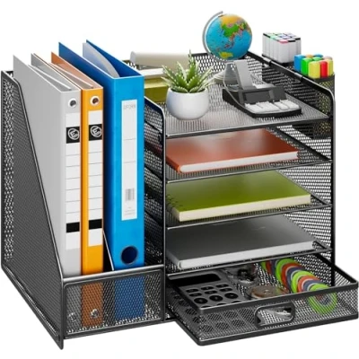 đăIdeal Desk File OrganizerăDesk organisers and storage includes 1 vertical file holder,4 paper letter tray,1 sliding drawer,2 hanging pen pencil holder,HMXLJJY desk organizer supplies can keep the desktop clean and tidy is absolutely your office accessories of best choice! đăPowerful Storage & Space Savingădesk organiser has vertical and horizontal storage,All office document folders,books and magazine would be organized by the vertical file holder. All letter paper and thin office supplies by tray organization,The drawer organiser and hanging pen holder enough accommodate all office supply accessories, such as pens, pencils etc. đăEasy to AssembleăAfter testing, the desk organisers can be quickly completed in 10 minutes (package including the tools needed for the assembly),Donât worrying about anything related to assembly. đăQuality metalăThe desktop organiser made of sturdy mesh metal construction,The structure is stable,durable powder coat finish, anti-oxidation and anti-rust that makes it have long-lasting strength and reliable performance. đăSatisfaction GuaranteeăAll our Office Supplies are made with one thing in mind; making your everyday tasks and work easier. We fully stand behind our productâs premium quality and we know that you will enjoy using them as well.