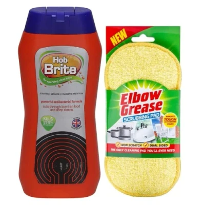 Hob brite cream cleaner, a powerful and fast acting cream hob cleaner for ceramic, halogen, electric, induction hubs. A specially designed hob cleaner formula that cuts through the toughest grease and grime leaving your hob sparkling clean. Effective for removing burnt-on food residues and bacteria from your hob. Use regularly to Leave a film on hob top that protects against staining and bacteria growth. Multipurpose Scrubbing Pads: Dual sided cleaning pads suitable for use on ovens, bathroom, dishes, microwave, floors, toilet showers etc. Soft side (non-scratch) is perfect for delicate surfaces and abrasive side is ideal for removing stubborn stains from oven, surfaces, etc. Pack contains 1X hob brite hob cleaner and 1X multipurpose scrubbing Pad