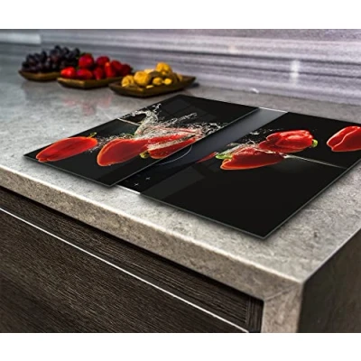 Hob Cover Chopping Board, Toughened Glass, Red Peppers on The Black Background, Set of 2 , Va Art Glass (2X Wide 30 x Height 52/cm)