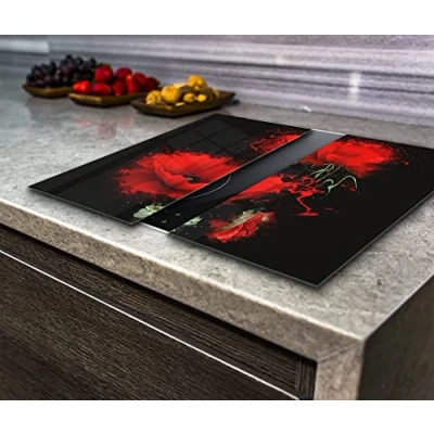 Hob Cover Induction Electric Cooker, Chopping Board, Toughened Glass, Red Flowers on the Black Background, Set of 2, Va Art Glass (2x wide 40 x height 52 /cm)
