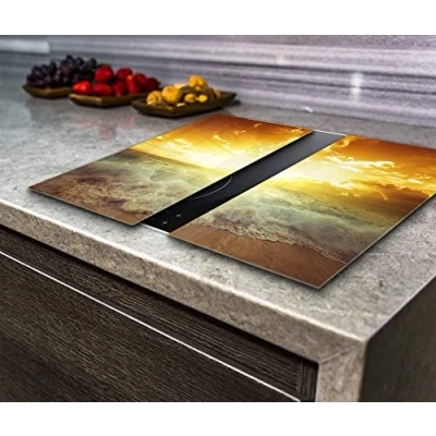 Hob Cover Induction Electric Cooker, Chopping Board, Toughened Glass, Sea Waves, Set of 2, VA Art Glass (2x wide 30 x height 52 /cm)