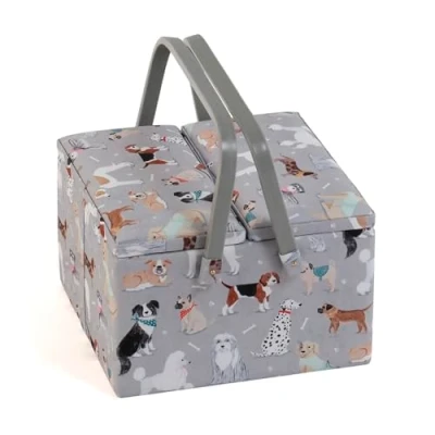 Hobby Gift Exclusive Large Twin Lid Sewing Craft Storage Box, Accessories Tray Pin Cushion Pockets PVC Handles, 25 x 17cm, Grey Dogs