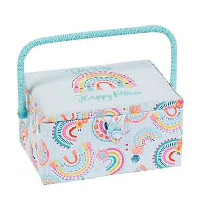 Hobby Gift Exclusive Medium Sewing Craft Storage Box, Accessories Tray Pin Cushion Pocket PVC Handle Embroidered Lid 18.5 x 25.5 14.5cm, Rainbow
