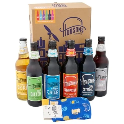NEW MIXED BEER & NOVELTY SOCKS GIFT BOX – A fun gift with a great selection of 6 x 500ml craft beers and some very snazzy cotton socks, perfect for a friend, Dad, brother or colleague. Please note the socks are one size only - Size 6-11, EUR 40-45. 500ML BEER – The finest fresh selection of Hobsons most popular real ales in a bottle. Gift set includes 6 x 500ml bottles packaged in a smart sturdy gift box which is divided to protect the bottles. The handpicked range of pale ales, traditional bitters, dark beers and hoppy ales all brewed in Shropshire by Hobsons Brewery. RANGE - The gift set includes our award-winning golden ale "Town Crier", a hoppy amber bitter "Manor", a light blond beer "Twisted Spire", a crisp pale ale "Shropstar IDEAL CHRISTMAS BEER GIFT - Our Mixed Ale Taster box with Socks is an excellent gift for any beer lover, it gives a good choice of premium real ales and craft beers. Perfect as a birthday treat, thank you gift or ideal when searching for that special Father's Day or Christmas present. WHO IS HOBSONS? Hobsons is an independent brewery based in the beautiful Shropshire countryside and has been brewing award-winning beers since 1993. Not only have Hobsons achieved an array of awards including CAMRA Beer of Britain in 2007 but are one of the most sustainable breweries in the UK – 2021 Best Green Business Award, Society of Independent Brewers. BOTTLE CONDITIONED – All the bottles apart from Twisted Spire are Bottle Conditioned which includes a natural sediment. ALLERGEN - Gluten (Barley) unsuitable for vegans.