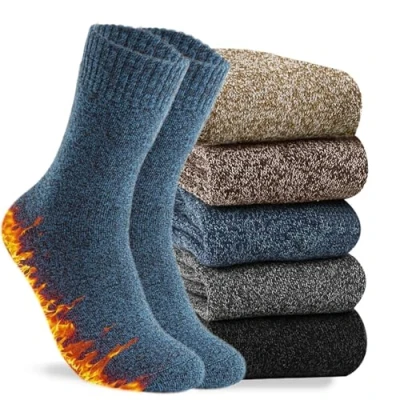 [SIZE CARE]: These boot socks are designed to fit most men's sizes, ranging from EU 39-45 / UK 6-11. The ergonomic design of these thick socks allows them to conform to the shape of your feet, providing warmth and a cozy feel. [WARM & BREATHABLE]: These men's thermal socks are thick, soft and warm to ensure your feet will stay comfortable during the cold winter. These warm socks effectively wick away moisture from the skin, preventing your feet from sweating excessively and creating a comfortable, dry environment. [5 PAIRS WARM WOOL SOCKS]: The Hocerlu thermal socks for men are made from a wool and polyester blend that strikes the perfect balance between comfort and functionality. The inside of these socks is fully lined with terry, which is perfect for trapping your body heat while helping you bear the extra weight on your feet throughout the day. [FIT MANY OCCASIONS]: These wool socks for men feature a fashionable colour-block design that can be paired with any outfit. They are suitable for various occasions such as office, school, hiking, outdoor activities, sports, home, work, or as Christmas socks in the winter season or in any cold weather areas! [GREAT GIFT OPTION]: These thick winter socks are a must-have accessory item for cold weather. They make an excellent winter gift for family, friends, and anyone you love, whether it's for birthdays, Thanksgiving, anniversaries, or Christmas