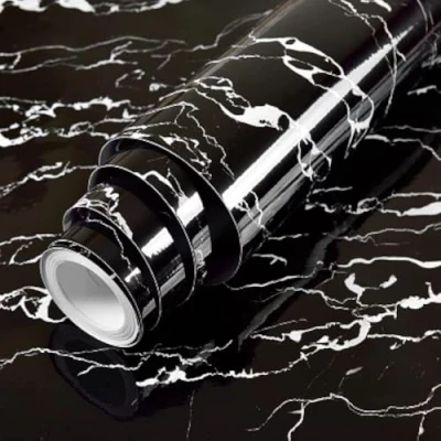 Hode Self Adhesive Wallpaper Sticky Back Vinyl Film Peel and Stick Removable Waterproof Decorative Sticker Roll (Black White Glossy Marble 40cmX3m) for Furniture Wall Door Table Shelf Countertop