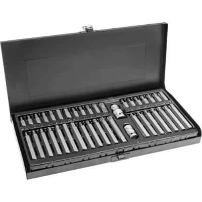 Robust steel: made of high-quality chrome vanadium steel, the bits offer maximum durability, are die-forged and withstand even high mechanical loads Comprehensive features: the set includes 40 different bit attachments - torx, spline and hex in two lengths (30 mm and 75 mm) - perfect for all common applications and repairs Precise fit: the precisely manufactured bit heads guarantee an optimal fit in screws and ensure safe, non-slip work with low wear and reliable torque Practical case: all attachments are neatly stored in a durable metal case, which ensures quick overview, safe transport and long service life Flexible use: thanks to the included adapters (3/8 inch and 1/2 inch), the bits can be combined with ratchets, sockets or screwdrivers - ideal for workshop or hobby, Manufacturer: Hoegert Technik