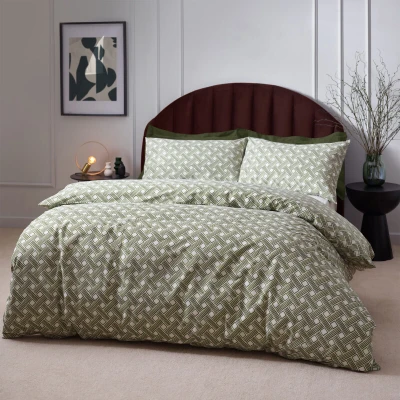 JoybuyThe Hoem Duvet Cover Set Alexa Olive Double features a watercolor geometric basket weave design on soft, cotton-rich fabric. It is double-sided, easy to care for, and certified by OEKO-TEX® for sustainable production.