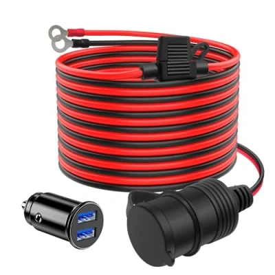 mini dual USB car charger: fast charging, suitable for 12-24V vehicles, compatible with cigarette lighter jacks of various models in the market. Heavy duty 15AWG cable: Input: DC 12-24V, Maximum output current: 20A, Cable length: 2 metres; Cigarette lighter female socket has a waterproof cover to effectively protect the internal circuitry and prolong service life. 20A Fuse: Cigarette lighter extension cable with replaceable 20A fuse, with overload, overheat, overvoltage, undervoltage and short circuit protection, safer to use. Power ring terminal: red wire connects to "+", black wire connects to "-"; 14 AWG high-performance copper wire, resistant to high current and high temperature, abrasion-resistant protection. Wide application: used for for vehicles, GPS, air pumps, inverters, car refrigerators, water heaters and other high-performance devices. Suitable for any DC 12V-24V marine boat, motorbike, boat, driving lawn mower, tractor, car, etc.