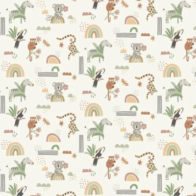 A fun animal themed wallpaper with a smooth matte finish, ideal for bedrooms, playrooms and nurseries The design features an eclectic mix of zebras, koalas, bush babies, toucans and snakes in soft neutral tones of green and beige, with patterns and motifs such as stripes, spots, rainbows and stars on an off white background Size: 10m (32.8ft) long x 53cm (21in) wide Pattern: Offset 26.5cm pattern match, 53cm pattern repeat Paste the paper wallpaper, spongeable, easy to apply, Manufacturer: Holden Decor