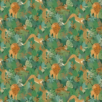 Bring the wild side to your walls with this vibrant and busy jungle inspired design. Featuring Lions, Tigers and Leopards grazing amongst luscious jungle leaves. Seen here in the Green colourway.
