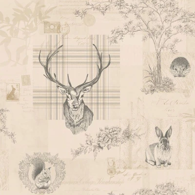 WallpaperDirectA montage of images celebrating country living: Stag, rabbit, hedgehog, squirrel, tartan, cable knitting, trees and postcards - a fun, quirky design - shown in the charcoal/linen.