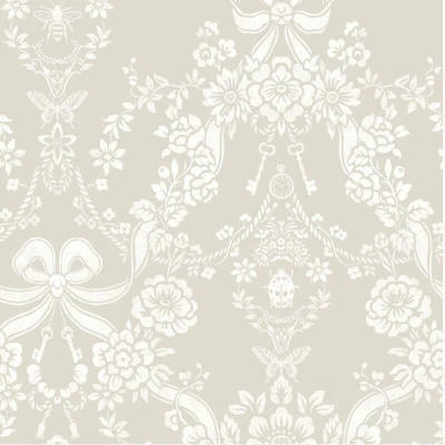 WallpaperDirectThis intricate design reimagines classic damask with a playful twist, featuring elegant ribbons and bows, vintage keys, pocket watches, butterflies, ladybirds and bees, all nestled amongst floral garlands and botanical flourishes.