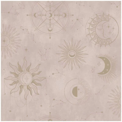 General description This enchanting wallpaper unveils a mystical and modern celestial narrative, featuring a captivating design that blends whimsical spirituality with luminous elegance. The background is a soft and ethereal pink hue, reminiscent of a dusky sky or a gentle blush, providing a serene and inviting canvas for the cosmic elements. Adorning this tranquil backdrop are meticulously detailed suns, moons, stars, and constellation patterns, all rendered in a magnificent gold metallic finish. The metallic gold elements catch the light beautifully, creating a subtle shimmer that enhances the magical quality of the design and brings the celestial symbols to life on your walls. This harmonious blend of soft pastels and shimmering metallics creates a truly mesmerizing visual, perfect for inspiring dreams and adding a touch of sophisticated whimsy to any space. Technical specifications Roll Size: 10.05m x 53cm Approx. Coverage: 5.25msq (56 sq.ft) Pattern Repeat: 26.5cm Offset Match