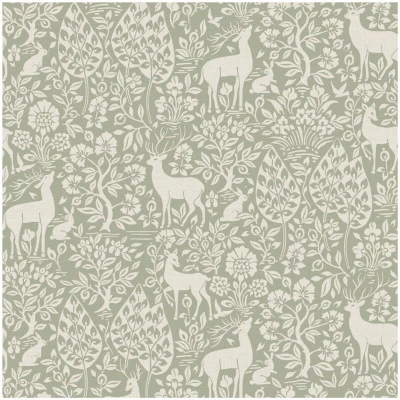 General description This enchanting wallpaper transports any room into a serene woodland sanctuary, featuring a captivating pattern that beautifully illustrates a tranquil forest scene. The design is rich with charming details, including graceful deer standing amongst lush foliage, playful rabbits nestled among wildflowers, and a variety of stylized trees with flowing leaves and branches. This idyllic tableau creates a sense of peaceful nature, inviting calm and contemplation into your living space. The background of this exquisite wallpaper is a soft, muted sage green, providing a calming and natural base for the intricate details. All the illustrative elements, including the animals, trees, and various botanical motifs, are rendered in a delicate off-white or very light cream color, creating a striking yet harmonious contrast against the sage backdrop. The illustrative style evokes a classic block print or a refined toile de Jouy, giving the wallpaper a timeless, artisanal appeal
