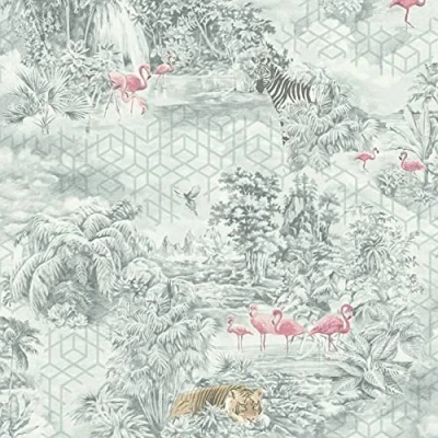 Holden Green Jungle Themed Wallpaper Tigers Pink Flamingos Zebras Geometric Shimmer