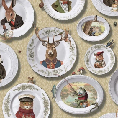 Holden Vintage Tea Party Ochre Wallpaper Animals Plates Paste The Paper