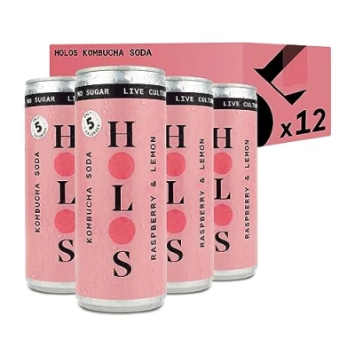 HOLOS Kombucha Soda Raspberry & Lemon Sparkling Vegan Sugar Free Drinks Gluten Live Culture Drink 12 x 250ml Cans