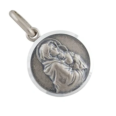 925 Sterling Silver St Mary with Baby Christ Small Pendant Surface: matte/blackened, diameter: 12 mm, eyelet: 3.5 x 2.5 mm, weight: 1.2 g. Includes black cotton ribbon, gift packaging and 100% cotton jewellery polishing cloth. AFP jewellery shop, high-quality silver jewellery in different styles.