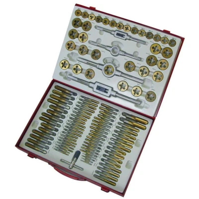 110pcs, TIN coated pre-main cutter, post-finish cutter and dies in the following sizes and pitches: M2x0.4, M3x0.5, M4x0.7, M5x0.8, M6x0.75, M6x1.0, M7x0.75, M7x1.0, M8x0.75, M8x1.0, M8x1.25, M9x0.75, M9x1.0, M9x1.25, M10x0.75, M10x1.0, M10x1.25, M10x1.5, M11x0.75, M11x1.0, M11x1.25, M11x1.5, M12x0.75, M12x1.0 M12x1.25, M12x1.5, M12x1.75, M14x1.0, M14x1.25, M14x1.5, M14x2.0, M16x1.0, M16x1.5, M16x2.0, M18x1.52 Die holders2 Tap holders1 T-tap holder Technical data Packaging width in mm: 400 Packaging length in mm: 500 Packaging height in mm: 100 Net weight in kg: 6,500 Gross weight in kg: 7