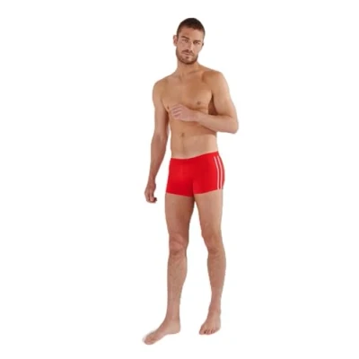 Men's Swim Trunks Plain red with stitched striped ribbons Soft inner lining Belt tie OEKO-TEX certified