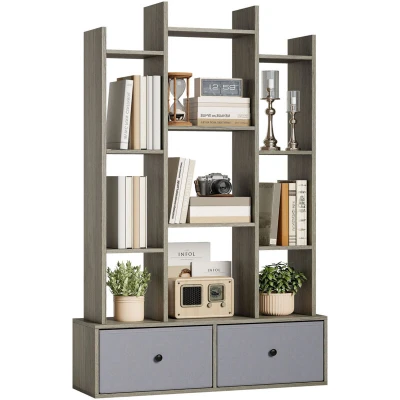 HOMCOM 12 Tier Bookshelf, Bookcase w/ 2 Folding Drawer, Graphite Wood Effect