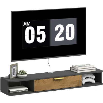 General description Elevate your living space with the HOMCOM floating TV cabinet. This chic wall-mounted TV unit maximizes upper space while offering ample storage with two open compartments and a flip-up door cabinet. Manage unsightly cables easily with built-in management holes, ensuring your setup is tidy and stylish. Its black and natural wood finish adds a touch of elegance to any room. Technical specifications Colour: Charcoal Grey, Nature Wood Finish Material: MDF Overall Dimension: 120W x 24D x 16H cm Cabinet Inner Size: 54W x 20D x 13H cm Open Compartment Size: 28.5W x 22D x 13H cm Router Hole Size: 22W x 2D cm Weight Capacity: 33 kg (overall), 15 kg (top), 8 kg (cabinet), 5 kg (shelf) Installation Wall-mounted design maximizes upper space, saving floor area Assembly required Usage Two open compartments for easy access to frequently used items Flip-up door cabinet hides clutter, maintaining clean aesthetics Cable holes streamline cable management, reducing tangling Router