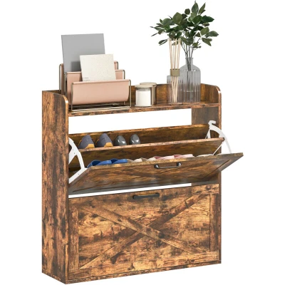 General description Farewell to cluttered shoe piles with the slim hallway cabinet from HOMCOM, designed to store up to 16 pairs of shoes. Enhanced with rustic farmhouse charm, this shoe storage unit fits seamlessly into any entryway, offering both function and style. Technical specifications Colour: Rustic Brown Material: Particleboard Overall Dimensions: 80W x 24D x 81.5H cm Drawer Panel Size: 77W x 35H cm Each Tier Size: 8.5W x 23.5D cm / 10.5W x 30D cm (adjustable shelf in inner position) Max Shoe Capacity: 16 Pairs Weight Capacity: 30 kg (overall), 10 kg (top/each drawer) Item Label: 837-557V01RB Usage Keeps 16 pairs of shoes organized and concealed Two flip drawers with adjustable shelves for varied shoe heights Top surface with raised sides holds keys or displays decor securely X-shaped barn doors on wood grain finish bring rustic farmhouse charm Slim depth fits easily in narrow spaces Half-wrap back design promotes airflow, preventing odour build-up Anti-tipping kit provides