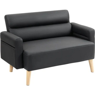 HOMCOM 2 Seater Sofa, Modern Faux Leather Couch Settee, Upholstered Small Sofa Loveseat with Wood Legs, Side Pocket for Living Room, Bedroom, Office, Black