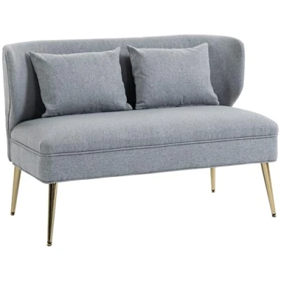 Elevate your cosy space with the HOMCOM 2 Seater Sofa! Compact at just 117 cm wide, it's great for snug flats or home studios. Sink into the thick, foam-padded seat wrapped in breathable linen-look fabric—great for movie nights or relaxed chats. The wing-back design offers gentle support, creating a comfortable seating experience. With reinforced metal legs, it's stylishly compact yet built to last. Specifications: ● Colour: Light Grey, Gold Tone ● Material: Linen (100% Polyester), Original Foam, Multilayer Board, Metal ● Overall Dimension: 117W x 65D x 78.5H cm ● Seat Size: 112W x 50D x 48H cm ● Seat Thickness: 23 cm ● Back Size: 117W x 38H cm ● Back Thickness: 10 cm ● Pillow Size: 43L x 33W x 13D cm ● Leg Height: 24 cm ● Weight Capacity: 220 kg ● Item Label: 83B-669V70LG Features: ● Compact design saves space in flats, studios, or bedrooms ● 23 cm thick foam seat ensures optimal comfort for long sitting hours ● Linen-look fabric offers breathable and stylish upholstery ● Wing-back