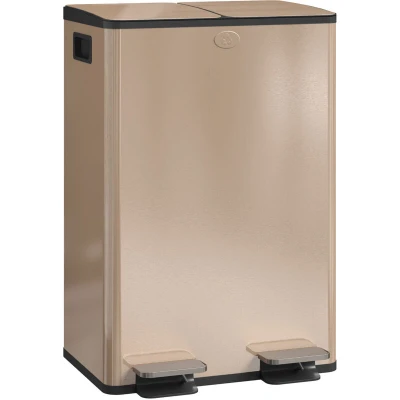 Double the compact hygiene, for the kitchen and beyond: this HOMCOM 28L double kitchen pedal bin. Made from stainless steel, this is a piece suited for everyday use the two-compartment design allows you to separate waste as needed. Place deodorisers in the lid slots to keep the smell fresh, with a stay-open option for super easy cleaning. So, when you feel stuck on space, go for this small but mighty dual rubbish bin. Specifications: ● Colour: Gold Tone ● Materials: 410 Stainless Steel, PP Plastic ● Overall Dimension: 45.8L x 36W x 67.6H cm ● Volume: 2 x 28L ● Item Label: 851-033V02GD Features: ● 2 x 28L capacity: dual bin holds plenty and can separate items however you need ● Stainless steel structure makes double bin robust. Sleek polished finish. Resists fingerprint marks for hygiene ● Removable inner buckets, with a hole to fix bin bag for easy cleaning ● Pedal operation opens lid easily. Lid can stay open when needed too ● No assembly required