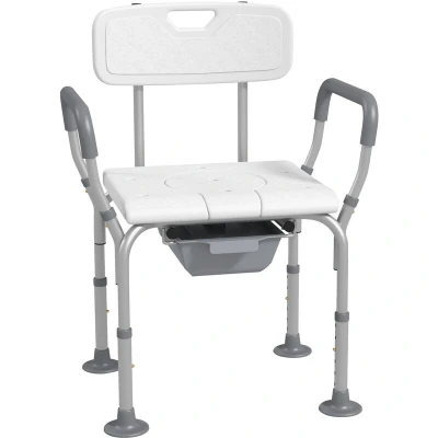 Amazon3-in-1 design: Chair can be used as bedside commode, shower stool and raised toilet seat. A handy, multifunctional piece. 70-82.5cm adjustable height: With 6 height settings, easily adjust this bathroom chair to the perfect position—suitable for a variety of users. Wide seat, armrests and removable bucket: Plenty of seated room on this bath stool. Easy to remove commode bucket to empty. Aluminium frame, with suction feet: Lightweight yet sturdy, this shower seat features large non-slip suction feet and supports up to 136 kg. Its aluminium frame is easy to clean, offering safety and convenience in the bathroom. Dimensions: 70-82.5H x 53.5W x 46Dcm. Seat: 37.3-49.8H x 42W x 46Dcm. Assembly required - no tools needed.