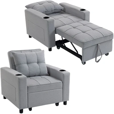 HOMCOM 3 in 1 Single Sofa Bed, Convertible Sleeper Chair Bed with Adjustable Backrest, Fabric Pull Out Pillow, Side Pockets and Cup Holders for Living Room, Bedroom, Small Space, Light Grey