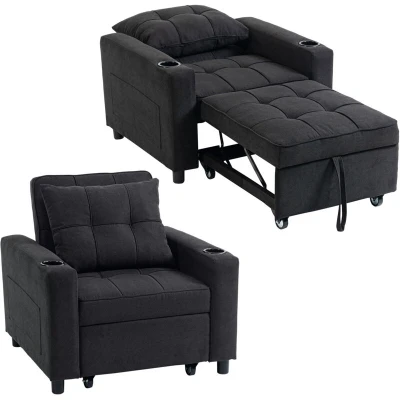 3-in-1 design: From an armchair, to a lounge recliner and single bed - easily changes via the pull-out design. Use this piece how you wish, to relax how you want in your living room, office, bedroom and other spaces 95 x 190 cm sofa bed size: Offering plenty of room to sleep and rest - even taller people. Filled with high-density foam, sofa bed is a comfortable piece which retains shape. Wrapped in smooth linen-look upholstery Three-level back: Set chair bed to sit upright, recline or lie flat - relax in the position you want. For watching TV, reading, resting and more. Pillow included for added comfort and support Cup holders and side pockets: Practical extra features - store drinks, magazines and remotes within reach. No need to move from bed chair once you're settled and comfortable Solid wood frame: This sleeper chair offers exceptional strength and stability, ensuring it withstands daily use. Enjoy peace of mind during everyday lounging or sleeping. Made from fire-retardant materials