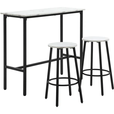 HOMCOM 3 Piece Bar Table Set, Modern Dining Set for 2 with Stools, Steel Frame, Footrest Kitchen, Living Room, Small Space, White