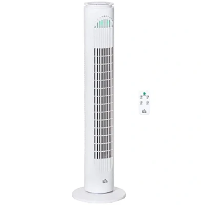 General description Keep yourself cool the easy way with this HOMCOM 30 Inch LED Tower Fan. The fan features a 70° oscillating movement that can be turned on and off, allowing you to cool a large area or focus on a specific direction. With three speed settings and three airflow modes—normal, natural, and sleep—you can customize your cooling experience. The fan can be controlled via the on-unit buttons or with the included remote, and it is equipped with a ten-hour timer, making it perfect for nighttime use. Technical specifications Color: White Material: ABS Plastic Overall Dimensions: Ф22 x 77H cm Main Body Size: Ф12 cm Base Size: Ф22 cm Power Cable Length: 150 cm Voltage: 220-240V/50-60Hz Power: 45W Item Label: 824-015V70WT Other information Heavy base for stability Modern design suitable for homes and offices Green LED light indicates speed setting, fan mode, and timer Assembly required